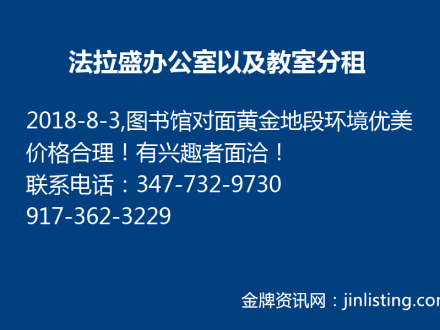 法拉盛图书馆对面黄金地段有办公室以及教室分租,联系电话: 347-732-9730/917-362-3229