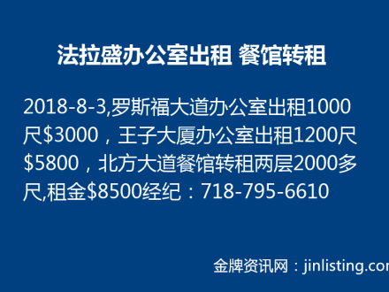 法拉盛办公室出租 餐馆转租,请电经纪:718-795-6610