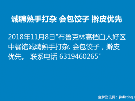 诚聘熟手打杂 会包饺子 擀皮优先6319460265