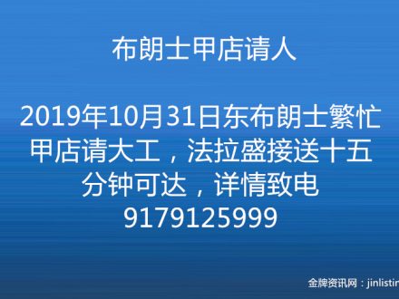 布朗士甲店请人 9179125999