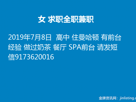纽泽西招聘兼职前台,每周做一到两日,需熟练开车熟练英文,家住法拉盛附近