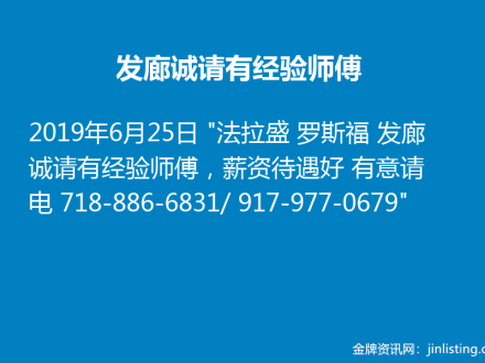 发廊诚请有经验师傅 718-886-6831