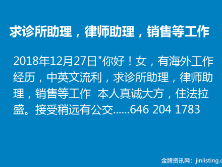 求诊所助理,律师助理,销售等工作646-204-1783