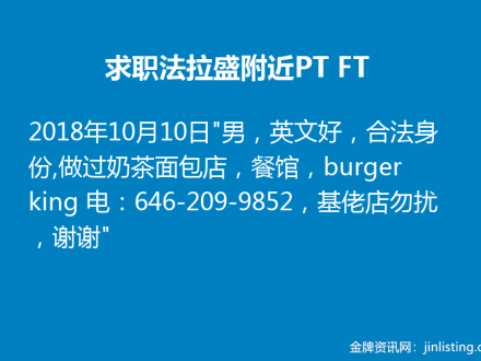求职法拉盛附近PT/FT 646-209-9852