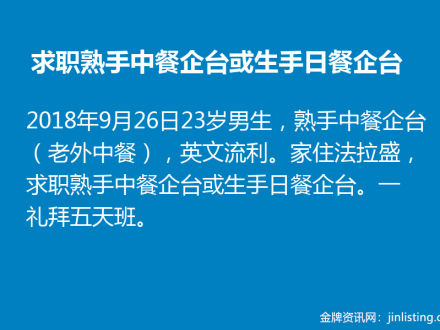 求职熟手中餐企台或生手日餐企台 929-372-2228