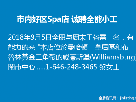市内好区Spa店 诚聘全能小工1-646-248-3465