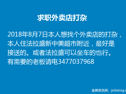 求职外卖店打杂347-703-7968