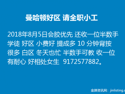 曼哈顿好区 请全职小工9172577882
