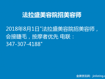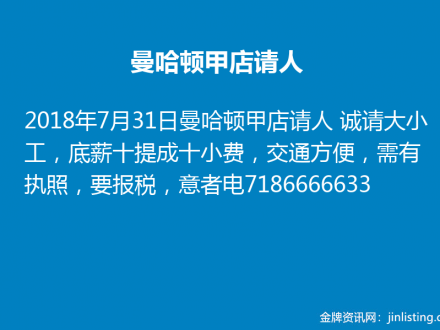 法拉盛高级理发店诚招发型师/烫染师/助手718-888-9310