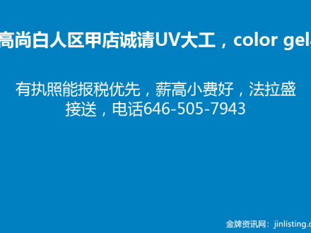 上州高尚白人区甲店诚请UV大工,color gel小工 646-505-7943