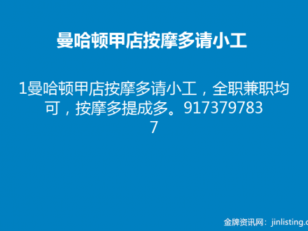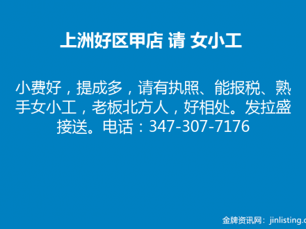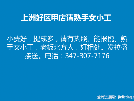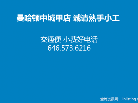 曼哈顿中城甲店 诚请熟手小工 646.573.6216