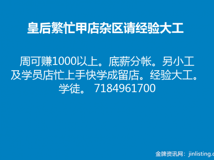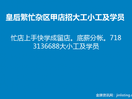 皇后繁忙杂区甲店招大工小工及学员7183136688
