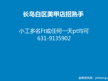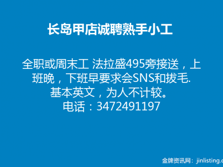 长岛富人区繁忙甲店招小工多名! 646-267-6527 or 718-666-9916