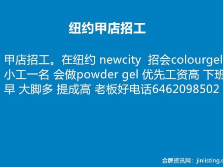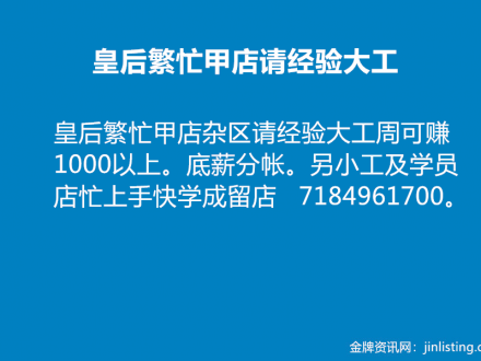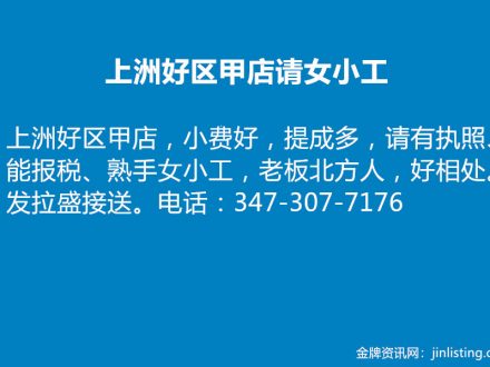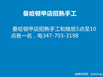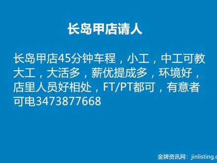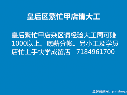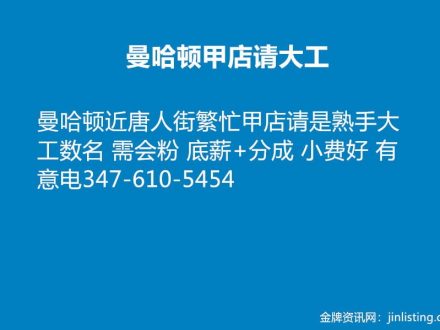 皇后区繁忙甲店请经验大工 718-496-1700