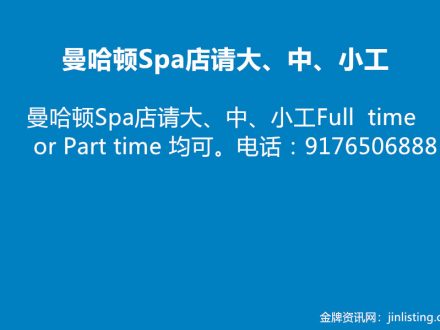 曼哈顿Spa店请大、中、小工 917-650-6888
