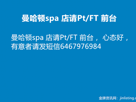 曼哈顿spa 店请Pt/FT 前台 646-797-6984