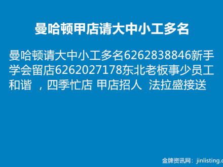 曼哈顿甲店请大中小工多名626-283-8846