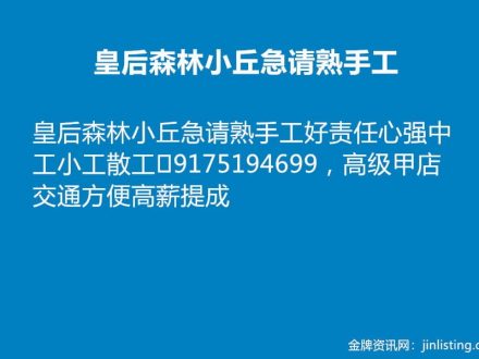 皇后森林小丘急请熟手工 917-519-4699