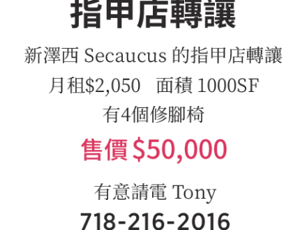 16年的纽约上州美甲店$30,000出让/甲店出兑/甲店转让/甲店出售