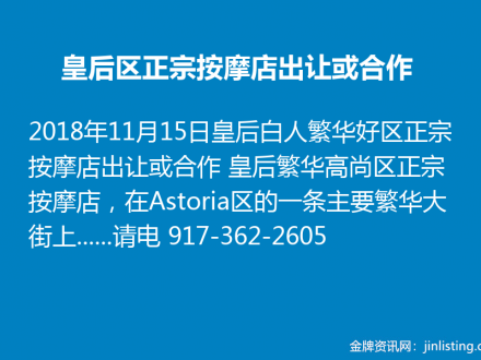 皇后白人繁华好区正宗按摩店出让或合作 917-362-2605