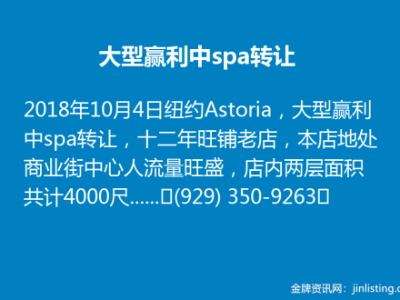大型赢利中spa转让(929) 350-9263