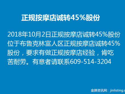 正规按摩店诚转45%股份 609-514-3204