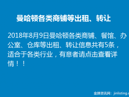 曼哈顿各类商铺、餐馆、办公室、仓库等出租、转让