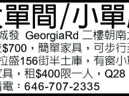 大單間 / 小單房 646-707-2335