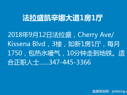 法拉盛凯辛娜大道1房1厅 347-445-3366
