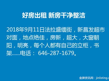 好房出租 新房干净整洁 646-287-1679