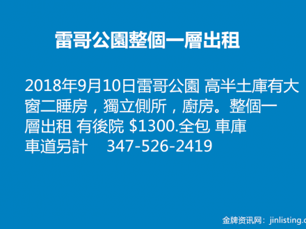 雷哥公園整個一層出租 347-526-2419