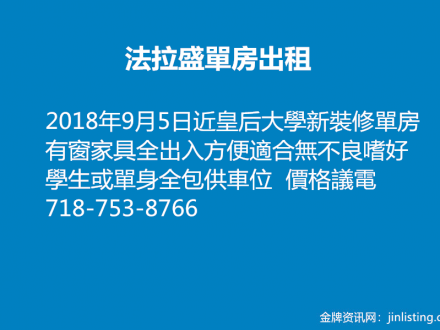 法拉盛 單房出租 718-753-8766