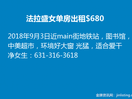 法拉盛女单房出租$680 631-316-3618