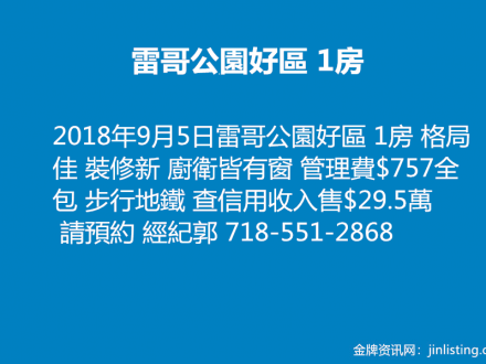 雷哥公園好區 1房出售 718-551-2868