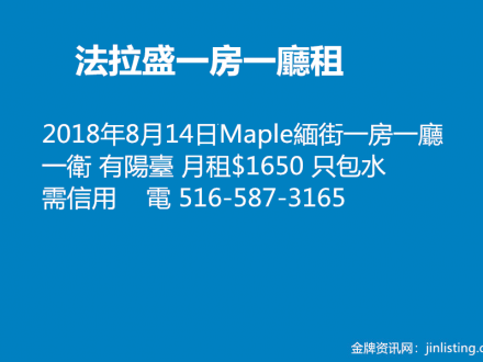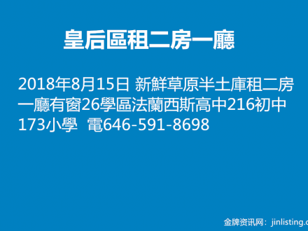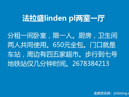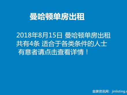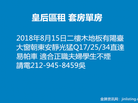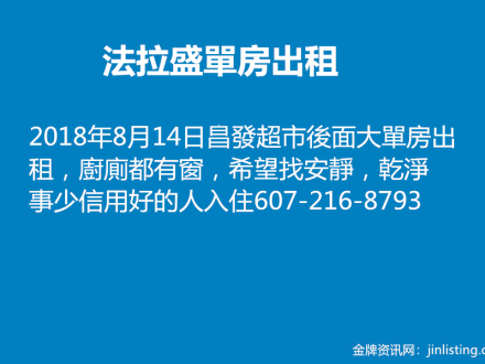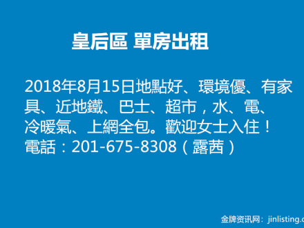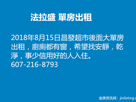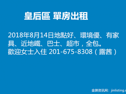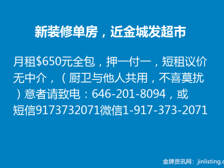 新装修单房,近金城发超市,适合单身人士。电:646-201-8094,或 文字短信:917-373-2071