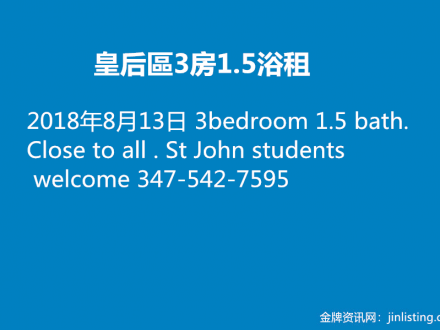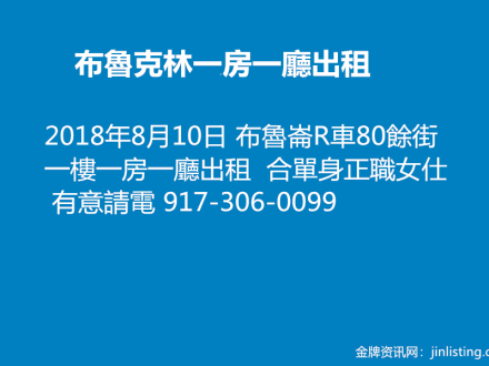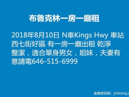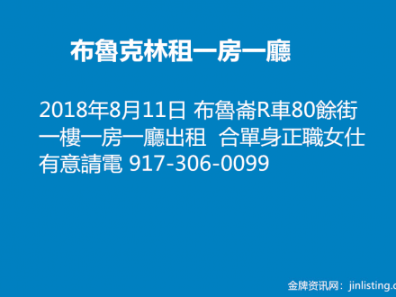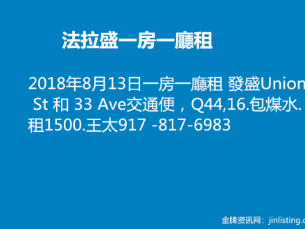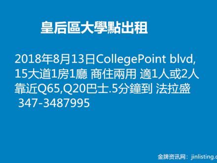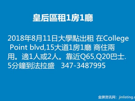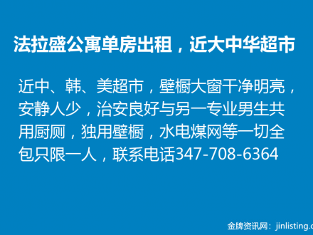 法拉盛公寓单房出租,近大中华超市,347-708-6364
