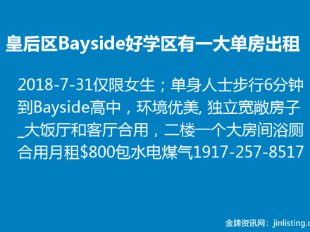 Bayside好学区有一大单房出租,仅限女生!!1917–257–8517