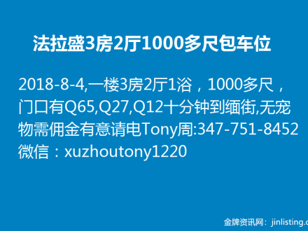 法拉盛3房2厅1000多尺包车位租$2300 347-751-8452