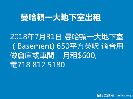 曼哈頓 Large Basement 出租 718 812 5180