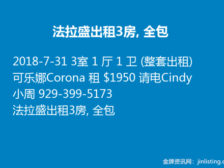 法拉盛出租3房, 全包-可乐娜Corona 租 $1950 请电Cindy 小周 929-399-5173