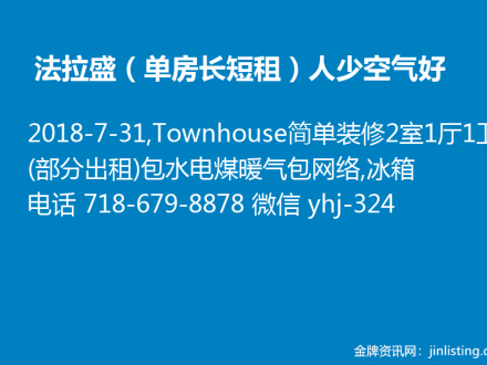 法拉盛(单房长短租)人少空气好,9月6日可入住 718-679-8878