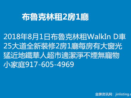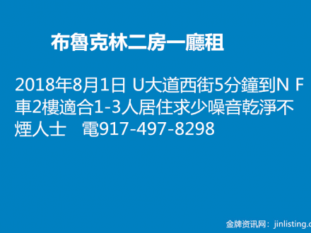 布魯克林租2房1廳 917-605-4969