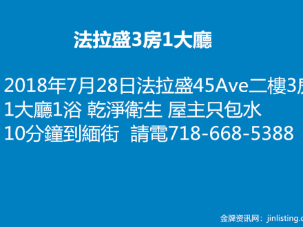 法拉盛34大道和友联街公寓一房一厅阳台包暖气和煤气1900