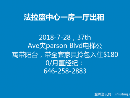 法拉盛中心37th Ave夹parson Blvd一房一厅出租