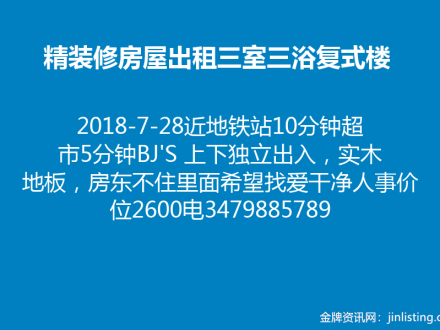 精装修房屋出租三室三浴复式楼 近地铁站,BJ’S 2600