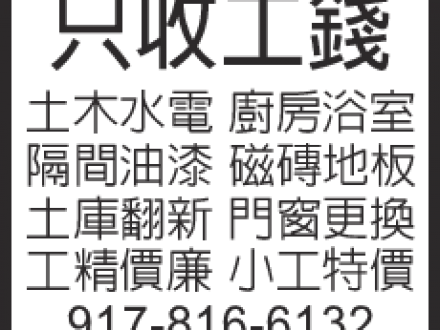 匠心装修,电话718-663-9606,商业住宅,精装加建,土木水电,厨房卫浴,地板油漆,价格公道,质量第一...