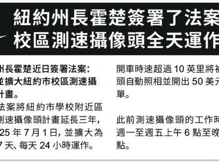 紐約州長霍楚簽署了法案 校區測速攝像頭全天運作