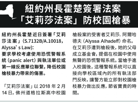 紐約州長霍楚簽署法案 「艾莉莎法案」防校園槍暴