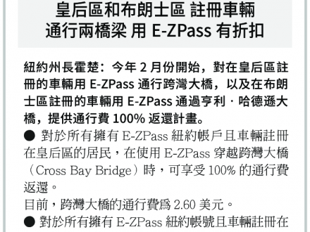 皇后區和布朗士區 註冊車輛 通行兩橋梁 用E-ZPass有折扣