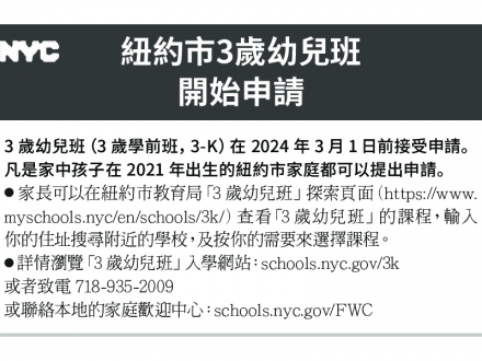 紐約市3歲幼兒班 明年1月10日開始申請